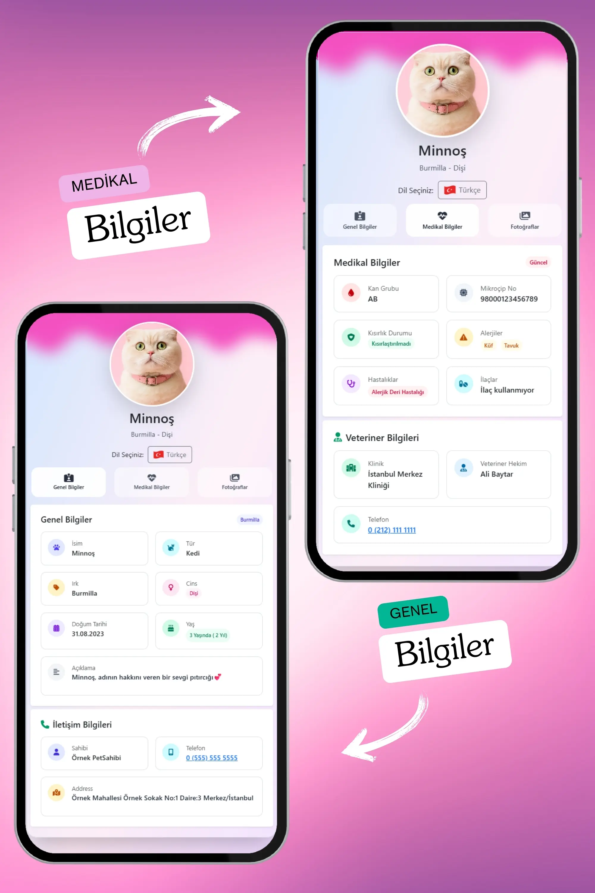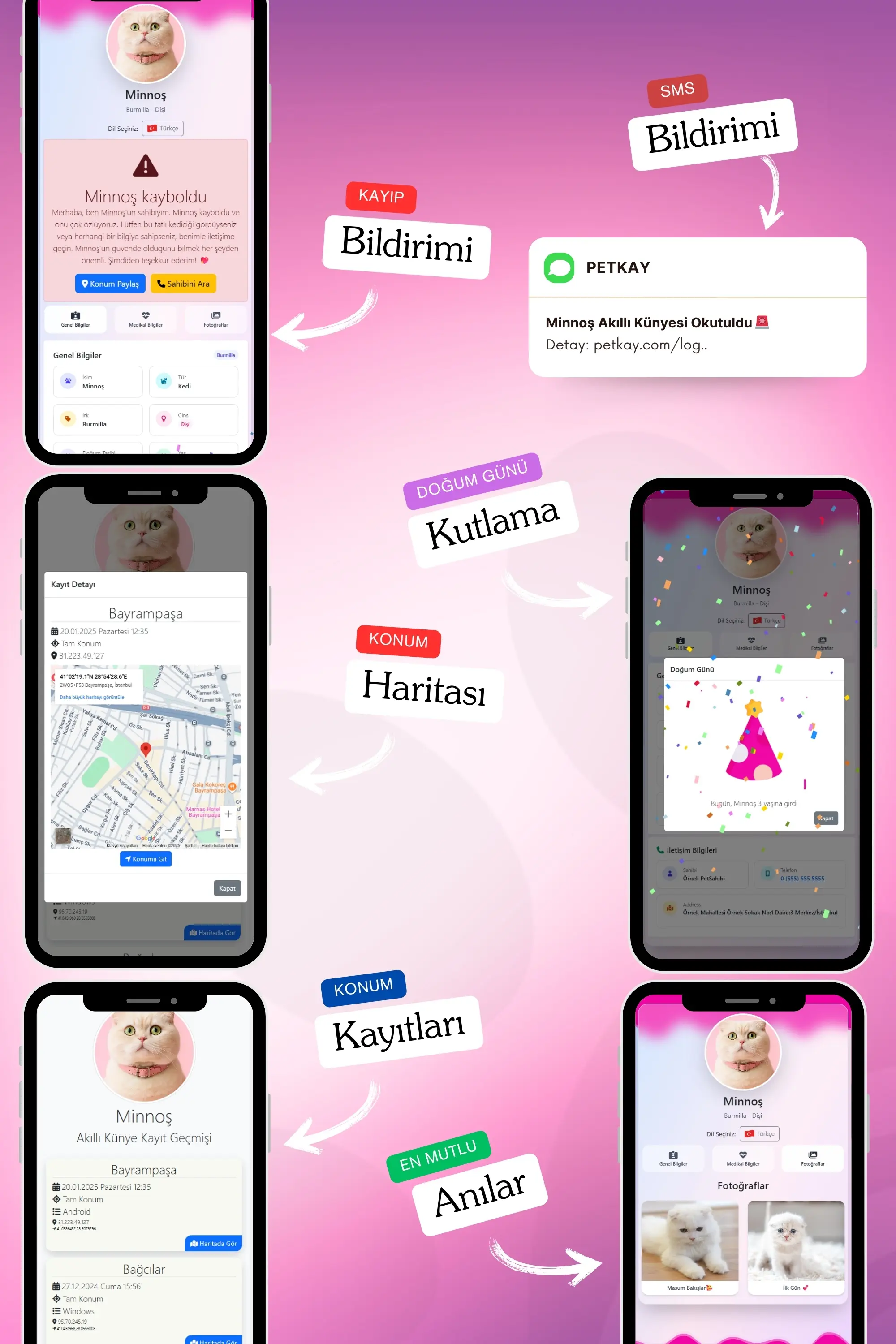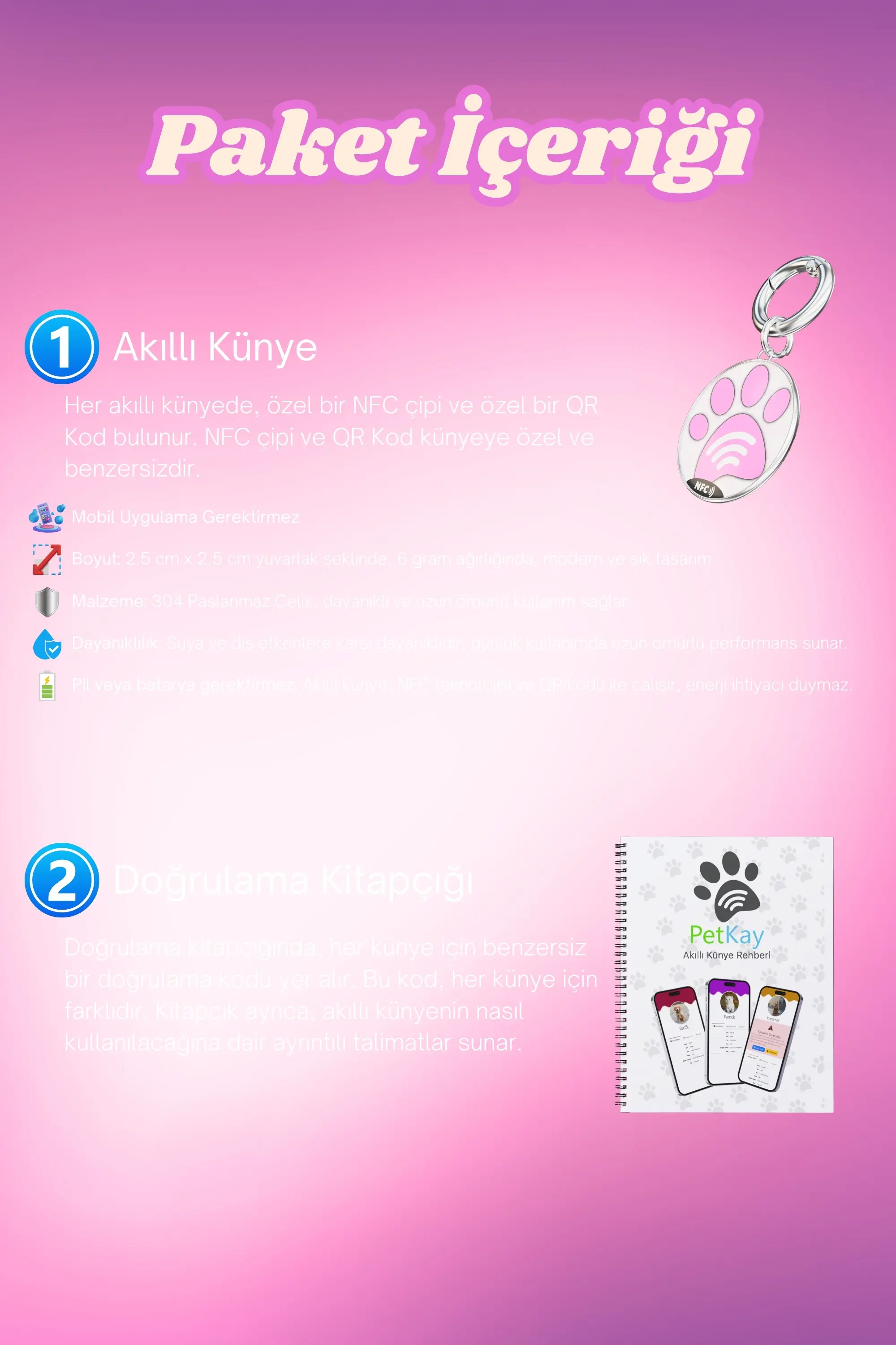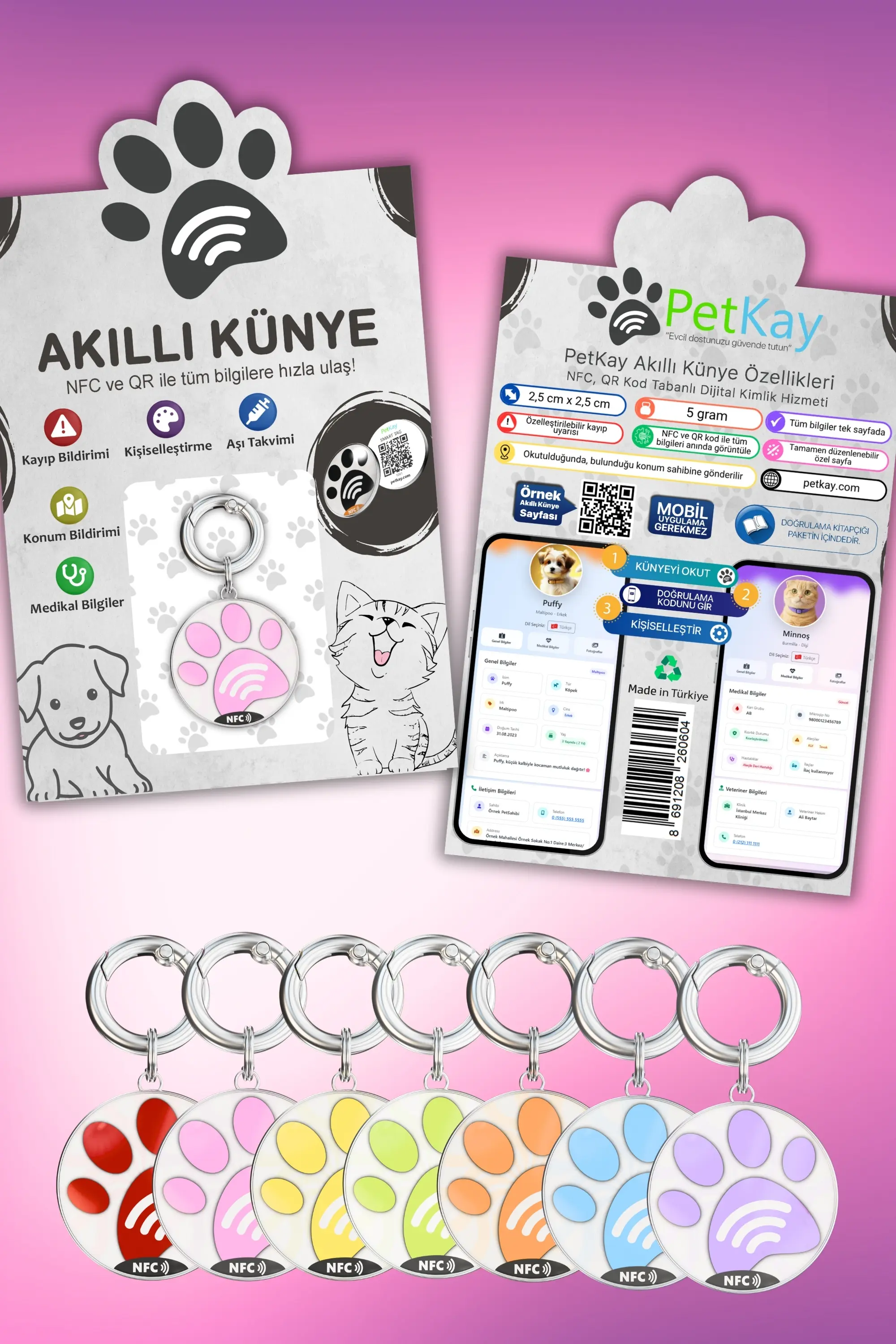 Petkay, kedilerin güvenliği için özel olarak tasarlanmış NFC ve QR kod teknolojilerine sahip akıllı bir künyedir. 2,5 x 2,5 cm boyutundaki şık paslanmaz çelik tasarımı sayesinde hem estetik hem de dayanıklı bir çözüm sunar. Bu künye, kaybolma riskine karşı modern bir koruma sağlar; QR kod veya NFC özelliği ile tarandığında, evcil hayvanın sahibiyle anında iletişime geçilebilir. Suya dayanıklı yapısı ve hafifliği sayesinde kedinizin günlük aktivitelerini kısıtlamadan sürekli kullanılabilir. Petkay, hem işlevsel hem de tarz sahibi kediler için ideal bir çözümdür!