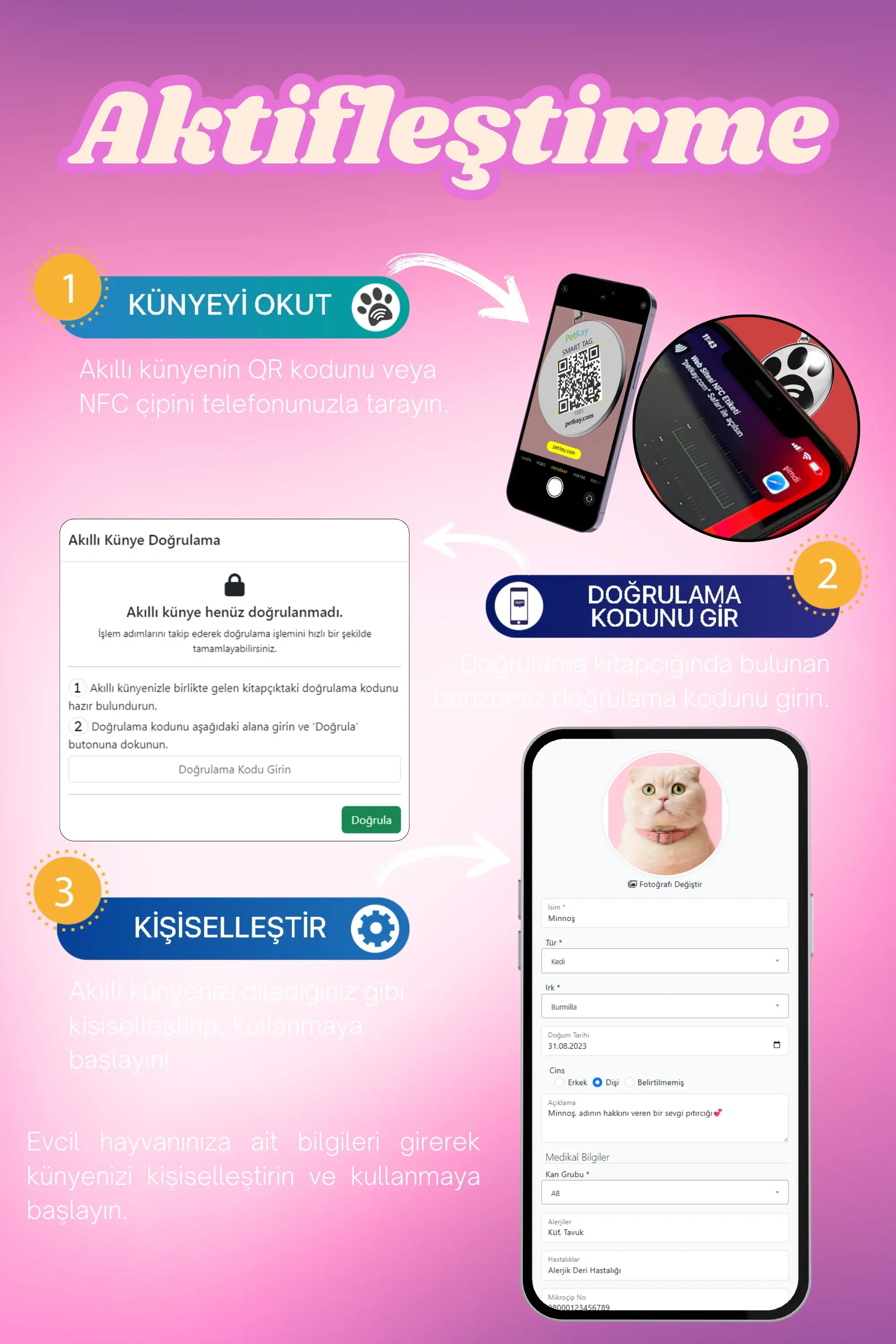 Petkay Kediler İçin Akıllı Künye NFC Akıllı Tasma Künyesi QR Kod Künye Paslanmaz Çelik Pembe (2,5 x 2,5 cm)